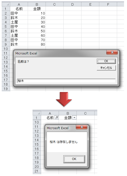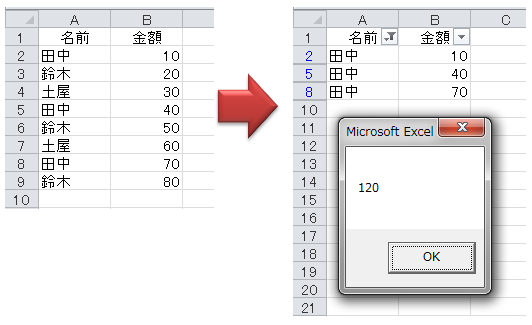 Range("A1").AutoFilter Field:=1, Criteria1:="田中"