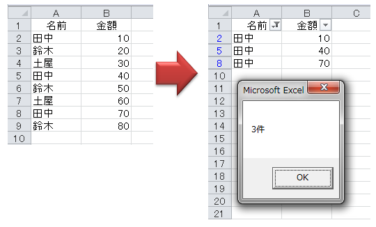 MsgBox Target & " は " & Result -1 & " 件あります"
