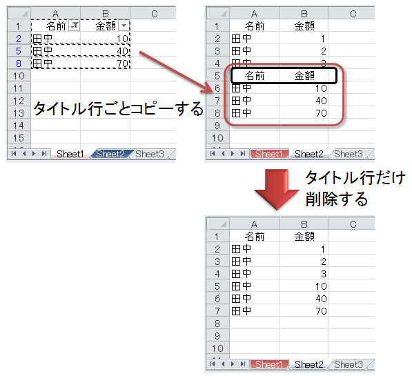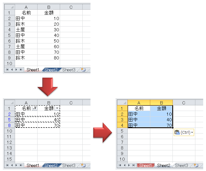 .AutoFilter Field:=2, Criteria1:=Member(i) ''2列目(B列)を3人の名前で順に絞り込む
