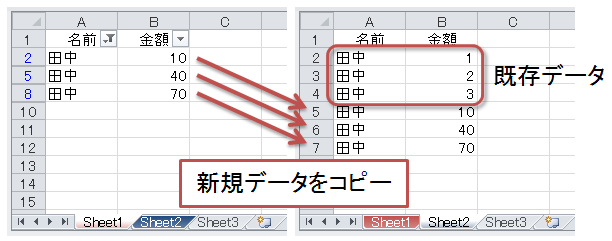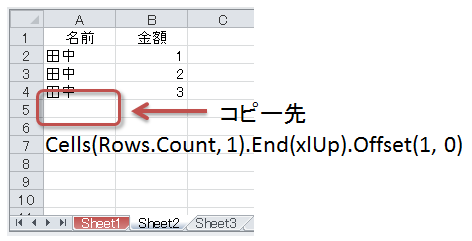 Set Target = Sheets("田中").Cells(Rows.Count, 1).End(xlUp).Offset(1, 0)