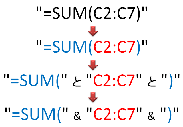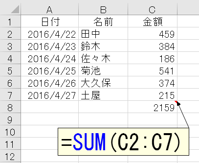 代入する "=SUM(C2:C7)" を、次のように分解して考えてみます。