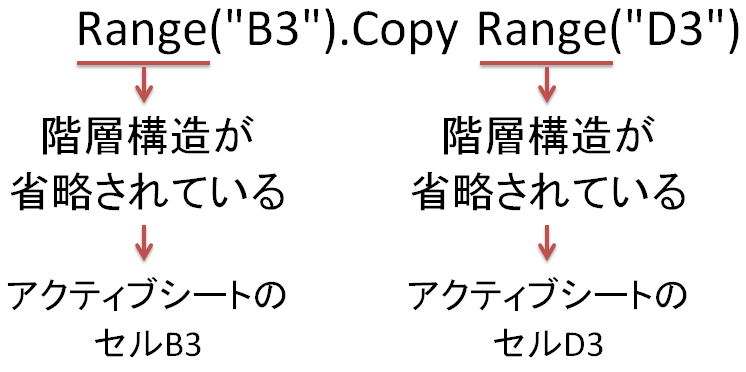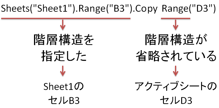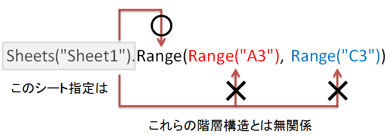 まずは復習です。セルを表す Range や Cells などは「ブック → シート → セル」の階層構造を省略すると、
