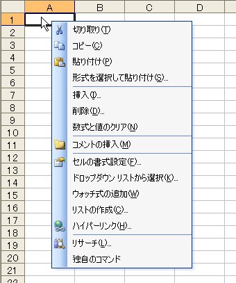 Sub AddMenu() Dim Newb Set Newb = Application.CommandBars("Cell").Controls.Add() With Newb .Caption = "独自のコマンド" .OnAction = "Sample" .BeginGroup = False End With End Sub Sub Sample() MsgBox Now End Sub