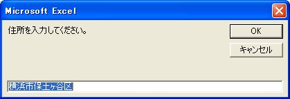 buf = InputBox(Prompt:="住所を入力してください。", Default :="横浜市保土ヶ谷区")
