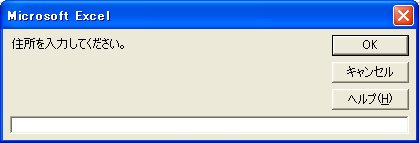 buf = InputBox(Prompt:="住所を入力してください。", HelpFile :="test.hlp", Context :=2)