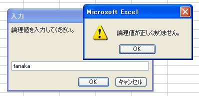 論理値を受け取ります。Excelでは、Falseは0と定義されていますが、Trueは「Falseでない数値」となります。したがって、Type:=4を指定して数値の「1」を入力するとTrueと判断されます。Falseになる数値は「0」だけです。論理値に変換できない文字列を指定するとアラートが表示されます。