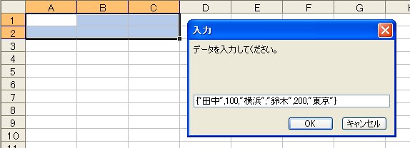 改行 が含まれていた場合、ダイアログボックス上では改行されません。入力用のボックスが1行しか表示できないのですから当然ですね。しかし、実際には改行コードが含まれているのですから、返り値をセルに入力すると改行されます。