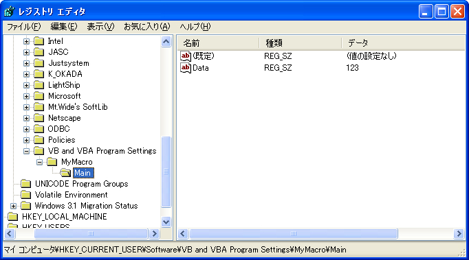 レジストリはツリー構造(階層構造)で管理されています。上記のサンプルで保存したレジストリデータは、「VB and VBA Program Settingフォルダ」内に「\MyMacro\Mainフォルダ」を作成し、そのフォルダに「Dataファイル」を作り、そのファイルに「123」というデータを書き込んだようなものです。