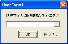 この[ダイアログ最小化]ボタンを持つコントロールの正体はRefEditコントロールです。UserFormで使うには次のようにします。