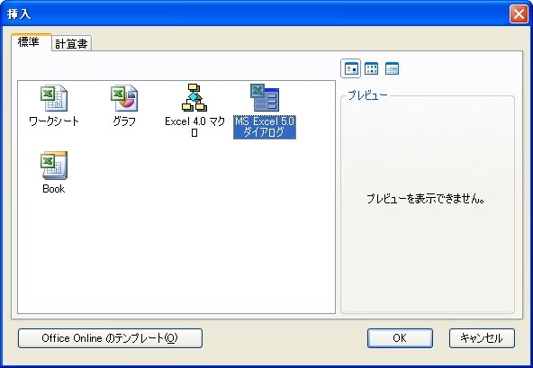 [標準]タブで「MS Excel 5.0ダイアログ」を選択して[OK]ボタンをクリックします。実行すると、新しいDialogシート[Dialog1]が挿入されます。このシート名は後で使いますから、覚えておいてください。