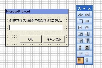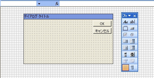 設計のしかたはUserFormと似ています。ツールバーから[ラベル]と[エディットボックス]を配置し、初めから用意されている[OK]ボタンと[キャンセル]ボタンの位置を変更します。ついでに、ダイアログボックスのキャプションも書き換えましょう。