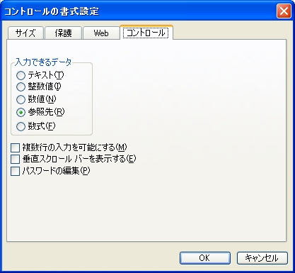 次に、配置したエディットボックスを右クリックして[コントロールの書式設定]を実行します。表示される[コントロールの書式設定]ダイアログボックスの[コントロール]タブで、「入力できるデータ」グループの[参照先]をオンにして[OK]ボタンをクリックします。