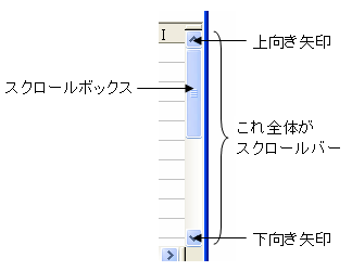 ワークシートをスクロールさせるときは、一般にスクロールバーを使います。スクロールバーは操作する場所によって、スクロールする量が異なります。スクロールバーは次のようなパーツで構成されています。