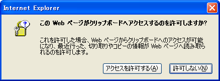 Internet Explorerはクリップボードを操作する機能があります。ということは、悪意を持ったページに「クリップボードのデータを盗み見」するスクリプトを仕込まれていると、クリップボードにコピーした情報が丸見えになってしまうのです。これはマズイです。そこで新しいInternet Explorer7.0では、スクリプトがクリップボードを操作しようとすると、次のような警告ダイアログボックスが表示される機能が追加されました。