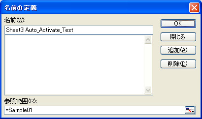(3)[名前]ボックスに「Sheet3!Auto_Activate_Test」と入力し、[参照範囲]ボックスに「=Sample01」と入力します