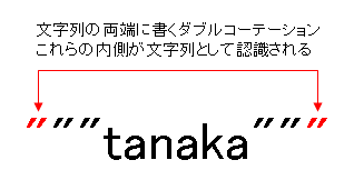 文字列はダブルコーテーション(")で囲む必要があります。つまり、文字列の両端は必ずダブルコーテーション(")でなければならないのです。この両端の「"」は、実際には表示されず、内側にあるのが文字列だということを示す特別な記号です。