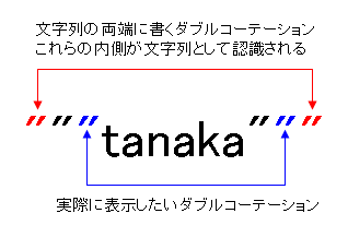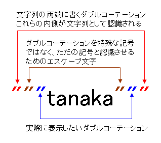文字列の内部でダブルコーテーション(")が2つ続いた場合には、特別な記号ではなく、「"」を単なる記号として認識してくれるのです。いわば、最初の「"」は、後の「"」に対するエスケープ文字的な働きをします。