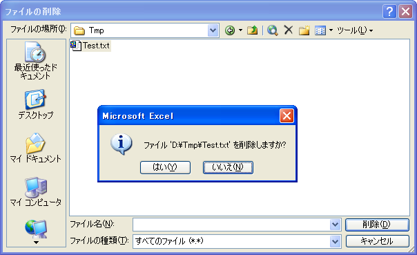 引数pathnameには削除するファイル名を指定します。次のサンプルは、"D:\Tmp\Test.txt"が存在した場合に削除します。
