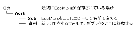 C:\フォルダに保存されているBook1.xlsをC:\Work\Subフォルダにコピーする