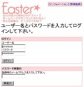 イースターのTOPページの「ログイン」というところをクリックすると、左のような画面になります。 メールで送られてきた「ユーザー名」「パスワード」を入力して「ログイン」のボタンを押します。 パスワードを忘れてしまった時は「パスワードの再発行」のところに登録時のメールアドレスを入力して「再発行」ボタンを押すと、新しいパスワードがメールで送られてきます。 |