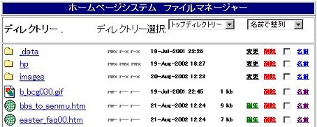 ファイルマネージャーの画面です。(せんむの例ですので、人によって違います) イースターのサーバ(HPがおいてあるコンピュータ)の中が見られます。最初は何もないと思いますが、すでにファイルを作成してある場合は、ファイルやフォルダ名が表示されます。