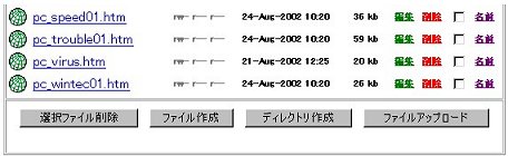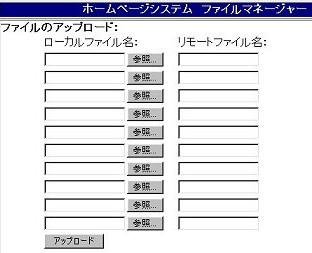 「ファイルアップロード」ボタンを押すと左の画面になります。 「参照」ボタンを押すとPCの中が参照できますので、アップロードしたファイル名を選択します。一度に10個まで選択できます。 「ローカルファイル名」は自分のPCの中にあるアップロードしたいファイルの名前、「リモートファイル名」はサーバの中にあるHPのファイル名です。 アップロードしたいファイルを選択したら「アップロード」ボタンを押します。これでアップロード完了です。 |