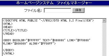 「ファイルを作成」を押すと左の画面になります。この画面でインターネット上でHTMLファイルを作成できます。 最初から左のような基本的なHTMLが書かれていますので必要な内容を書き足します。この場合、HTML(タグ)の知識が必要です。 HTMLファイルを書いたらファイル名(必ず半角英数字)を入力して「保存」ボタンを押します。 ファイル名には必ず拡張子「.html」または「.htm」をつけましょう。 【注意】この場合、直接サーバの中のファイルを操作しますので自分のPCの中にはデータは残りません。PCの中でデータを作成してアップロードすることをおすすめします。 |