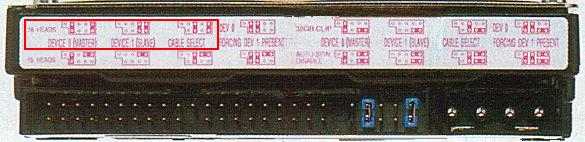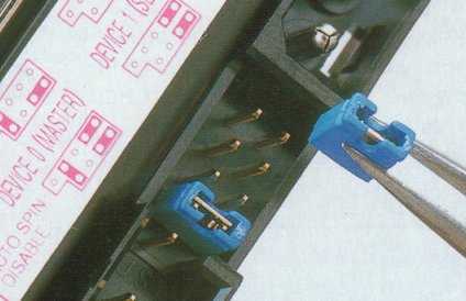 HDDのマスター、スレーブを切り替えます。 買ったばかりのHDDはマスターになっていますので、増設するHDDをスレーブに設定します。 ジャンパーピンをラジオペンチまたはピンセットなどでつまむとやりやすい。 |
