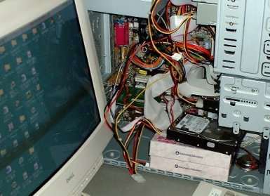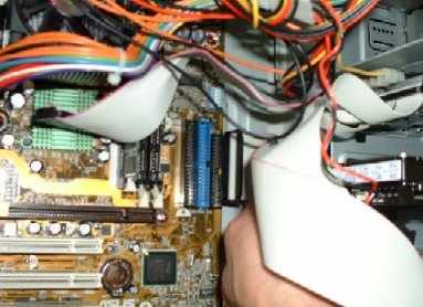 実際のPC内部。 3個並んだコネクタは左側から・・・・ CD-ROM用ATA33コネクタ 実際には、マザーボードにはケーブルが接続されているはずですので、古いHDDに接続されたケーブルの中間のコネクタを増設する新しいHDDに接続します。 |