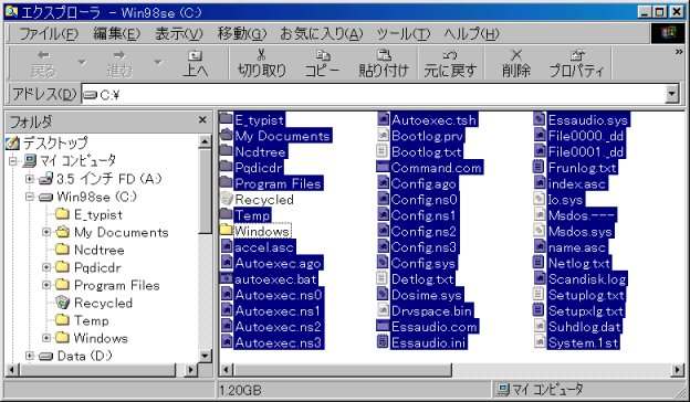 システムとデータのコピー システム全体とデータを古いHDDから新しいHDDにコピーします。 1.「スタート」→「設定」→「フォルダオプション」→「表示」タブで 2.エクスプローラーを起動します。 3.Cドライブを開き、「CTRL」キーを押しながら、WindowsフォルダとRecycledフォルダをクリック、「編集」→「選択の切り替え」をクリックすると。WindowsフォルダとRecycledフォルダ以外がすべて選択された状態になります。 4.WindowsフォルダとRecycledフォルダ以外のすべてのフォルダを新HDDの基本領域のドライブ(この例の場合、左側ウィンドウのDドライブのアイコン)にドラッグ&コピーします。