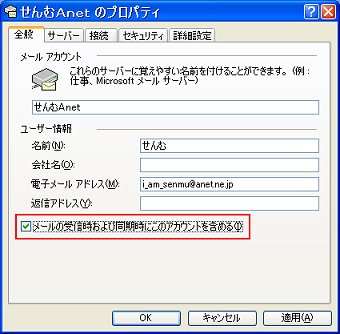 「ツール」→「アカウント」→「メール」タブ→「追加」→「メール」で、標準で使いたいアドレスをクリック、「既定に設定」を押すと、それを標準で使うアドレスに設定できます。 【各アドレスの詳しい設定】 1.「ツール」→「アカウント」→「メール」タブ→「追加」→「メール」タブをクリック 2.該当のメールアドレスを選択し、「プロパティ」をクリック 3.「全般」タブをクリック