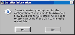 「ActivePerl-5.8.0.805-MSWin32-x86.msi」 のアイコンをクリックしてインストール開始です。 1. ![]() [Next] をクリックして次へ進みます。 2. ![]() 規約が表示されます。 同意する(I accept the terms in the License Agreement)にチェックして、 [Next] をクリックします。 3. ![]() インストールする機能を選択します。 普通はそのまま[Next] をクリックして次へ進みます。 4. ![]() [Next] をクリックして次へ進みます。 5. ![]() [Next] をクリックして次へ進みます。 6. ![]() [Next] をクリックして次へ進みます。 7. ![]() インストール作業が開始されます。 8. ![]() [Finish] をクリックして次へ進みます。 9. ![]() コンピューターを再起動するかどうか聞いてきます。 [Yes - すぐに再起動] か [No - 後で再起動] を選択する。 ここでは [Yes] をクリックして再起動を行なってください。 以上で「ActivePerl」 のインストールは終了です。 「Apache」 のインストールがまだの方は、引き続き「Apache」 のインストールを行なってください。 ⇒ Apache(Webサーバー) のインストール方法 |
