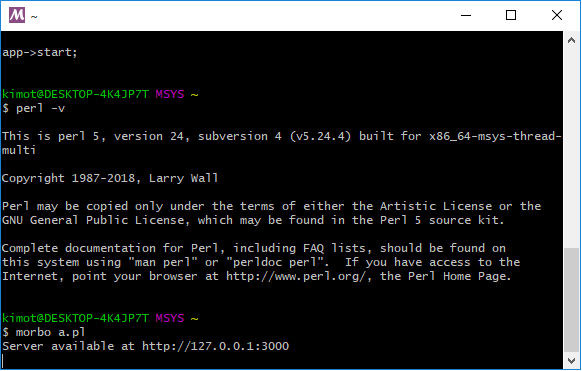 POSIX互換レイヤーがありますので、Linuxでの起動を前提とした、Mojoliciousの開発サーバーも正しく動きます。
