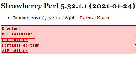 ほとんどの場合は64bit版のWindowsで大丈夫だと思いますが、32bit版が必要な方は、32bitの方のStrawberry Perlをダウンロードしてください。