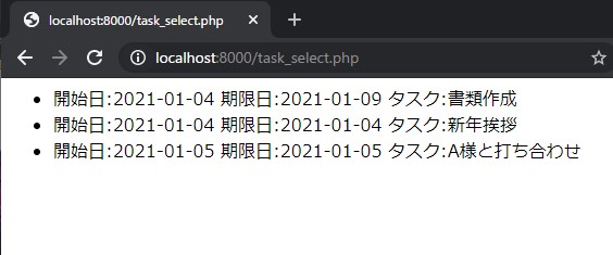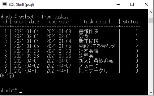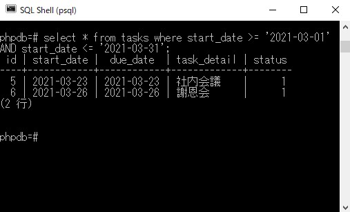 <?php // SQL文の定義 $sql = 'SELECT start_date, due_date, task_detail FROM tasks WHERE start_date >= $1 AND start_date <= $2'; // 検索する期間 $date_start = '2021-01-01'; $date_end = '2021-01-31'; // データ取得 $res = pg_query_params($dbconn, $sql, array($date_start, $date_end)); // 取得内容のフェッチ $task_list = pg_fetch_all($res); if(count($task_list) === 0) echo '該当データなし'; // 取得結果表示 echo "<ul>"; foreach($task_list as $task){ echo '<li>開始日:'.$task['start_date']." 期限日:".$task['due_date']." タスク:".$task['task_detail']."</li>"; } echo "</ul>"; |