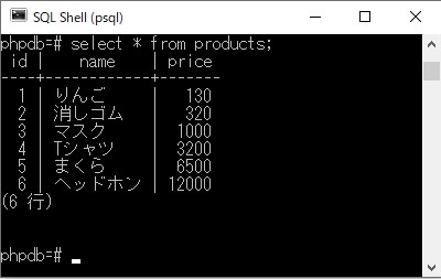 <?php // 挿入対象のデータ配列 $input_product_list = [ 'りんご' => 130, '消しゴム' => 320, 'マスク' => 1000, 'Tシャツ' => 3200, 'まくら' => 6500, 'ヘッドホン' => 12000, ]; // SQL文の定義 $insert_sql = 'INSERT INTO products (name, price) VALUES ($1, $2)'; foreach($input_product_list as $name => $price) { // データ挿入 $res = pg_query_params($dbconn, $insert_sql, array($name, $price)); } |