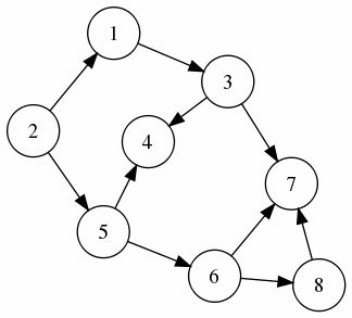 1 ~ 8 までの仕事があったとする. 1 の仕事をするには 2 の仕事ができていなければならない. 3 の仕事をするためには 1 の仕事ができていなければならない. 7 の仕事をするためには, 3, 6, 8 の仕事ができていなければならない. etc という関係を有向グラフを用いると次のように表現できる