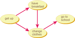朝起きてから学校に行くまでの簡単な手順を示しているが, このグラフから様々な要素が読み取れる. 例えば, 朝起きてから朝食を食べなくても学校へ行けるが, 着替えなげれば学校に行けないことがわかる.