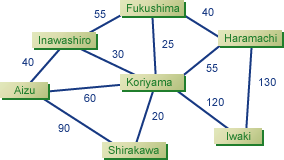各ノードが市町を表し, エッジが市町を行き来するのにかかる時間を表している (架空のもの) あるからある町への最短路を求めたいなどの類の問題はよくある.