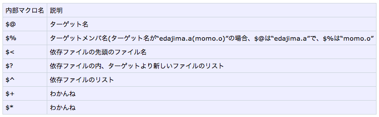 と解釈される. 依存ファイル名のリストを表す “$^” という内部マクロもある.