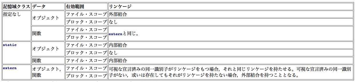 プログラムが複数のソースファイルから構成される場合, それらすべてのソースファイルにおいて同一のオブジェクト, あるいは関数として参照.