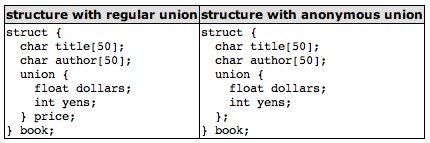 The only difference between the two pieces of code is that in the first one we have given a name to the union (price) and in the second one we have not. The difference is seen when we access the members dollars and yens of an object of this type. For an object of the first type, it would be: