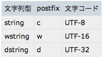 文字列リテラルの型を明示するときは次の postfix を付ける.