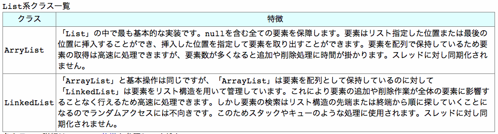 list 系のクラスも他のクラスと同様にインスタンスを生成し使用するが, [JDK 5.0] 以降からは [Generics] という機能が追加されインスタンス生成時に要素の型も宣言するようになった. 例として [ArrayList] の場合の書式は次のようになる: