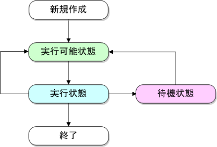 スレッドが起動 (start メソッド) されたときこの状態になる. JavaVM のスケジューラーがスレッドの優先順位に基づいて, スレッドを実行状態に遷移させていく.