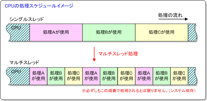 但し, マルチスレッド処理を行えば, すべての事象において必ずその成果がみられる訳ではない. まずマルチスレッド処理の仕組みを考え, どのような時にマルチスレッド処理が有効なのかを知る必要がある.