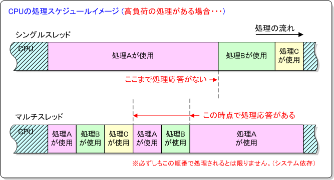 上記の場合, シングルスレッドでは [処理A] が終了するまで [処理B], [処理C] は処理されない, つまりシステムの応答が帰ってこない. 従って負荷の高い処理が行われるといちいち待たされるような感じになる.
