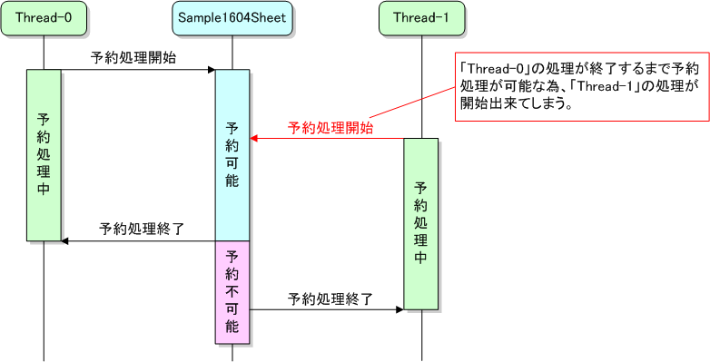 この例は最初のスレッドが予約処理中 (シートの内部変数を予約済みに変更する前) に別のスレッド予約処理を行ってしまったのが原因である.