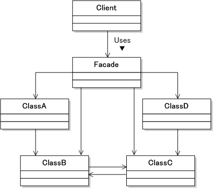 このパターンは, 複雑な内部処理 (データベース処理, 業務処理 etc) を隠蔽し, 利用者にシンプルなインタフェースを提供するパターンである.