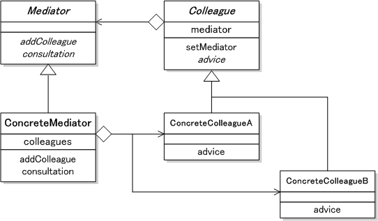 このパターンは, 複雑に絡み合った複数のオブジェクト間の関係を, 必ず [仲介者] を介して処理を行うようにすることで, 単純かつ明快なインタフェースを提供するパターン.